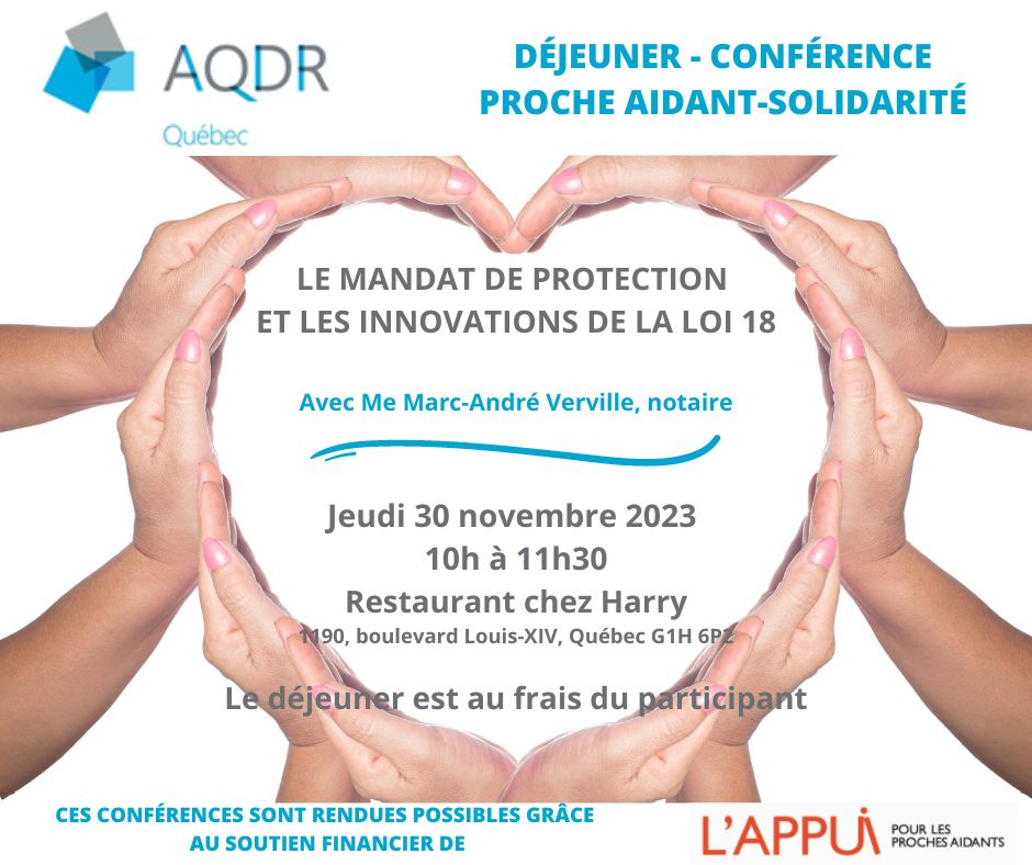 Le mandat de protection et les innovations de la loi 18 Avec Me Marc-André Verville, notaire Au restaurant Chez Harry, 1190 boulevard Louis XIV, Place Louis XIV, Québec G1H 6P2 Le jeudi 30 novembre 2023,...